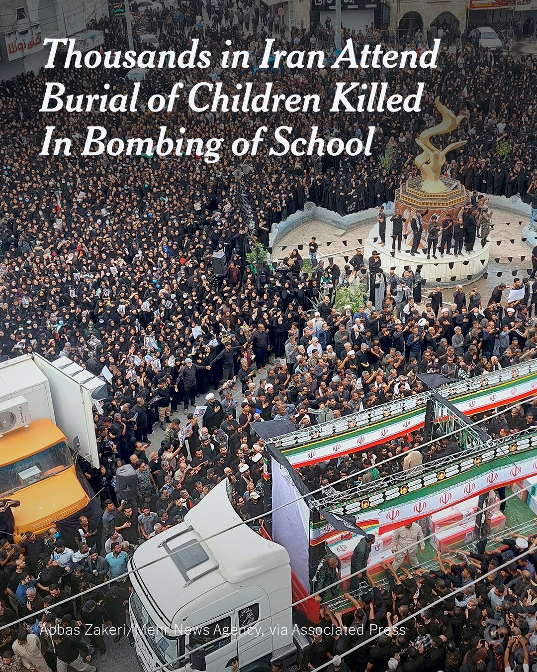 A photo distributed by Iranian state media showed thousands in the streets of a town in southern Iran on Tuesday during the funeral for victims of an airstrike on a girls’ elementary school that killed at least 175 people, many of them students, on Saturday. Neither Israel nor the U.S. has directly addressed the strike. https://nyti.ms/4aMbGkG