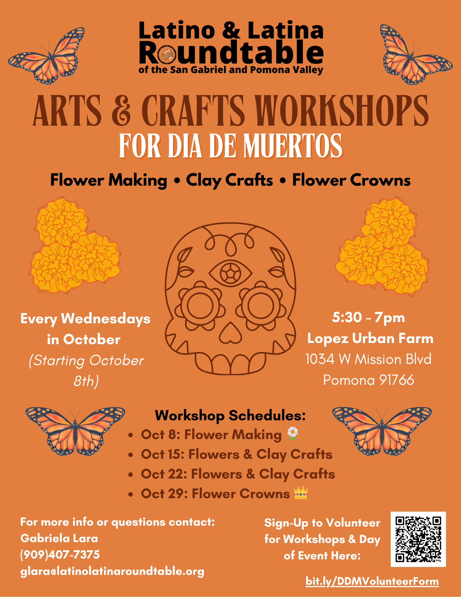 1. Come and help us make flowers for our annual Dia de Muertos event. Workshops and flower making start on October 8th. We will meet every Wednesday at Lopez Urban Farm from 5-7 pm.