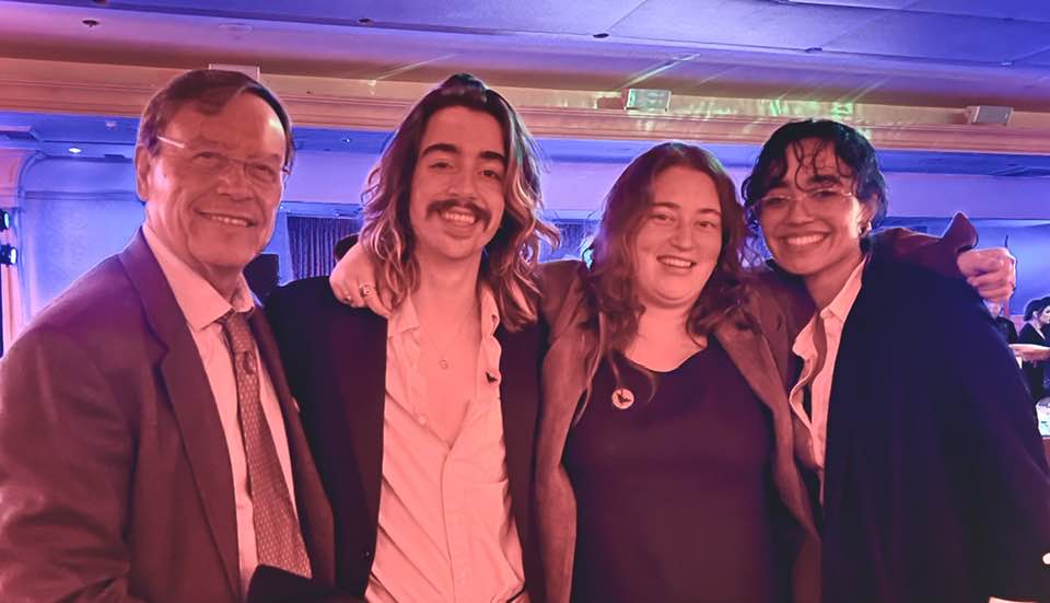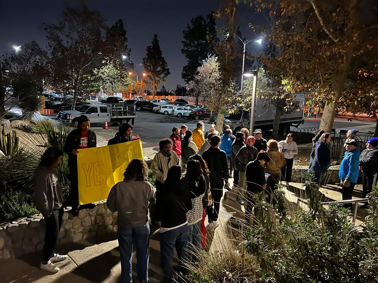Laud Olivia Meehan (Pitzer alum now organizing UFW student support efforts), Will Warrick (Pitzer student) and Lari (Scripps student) – participating in UFW 60th Anniversary celebration (here at 11 pm on Thursday night in L. A. and (with Will and Lari) joining workers five hours later on Friday morning at Pitzer College – at a 4 am gathering of dozens of workers – in preparation for voting on unionization.