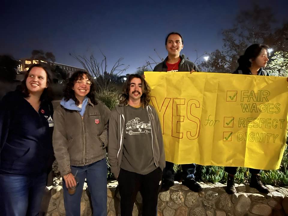 Laud Olivia Meehan (Pitzer alum now organizing UFW student support efforts), Will Warrick (Pitzer student) and Lari (Scripps student) – participating in UFW 60th Anniversary celebration (here at 11 pm on Thursday night in L. A. and (with Will and Lari) joining workers five hours later on Friday morning at Pitzer College – at a 4 am gathering of dozens of workers – in preparation for voting on unionization.